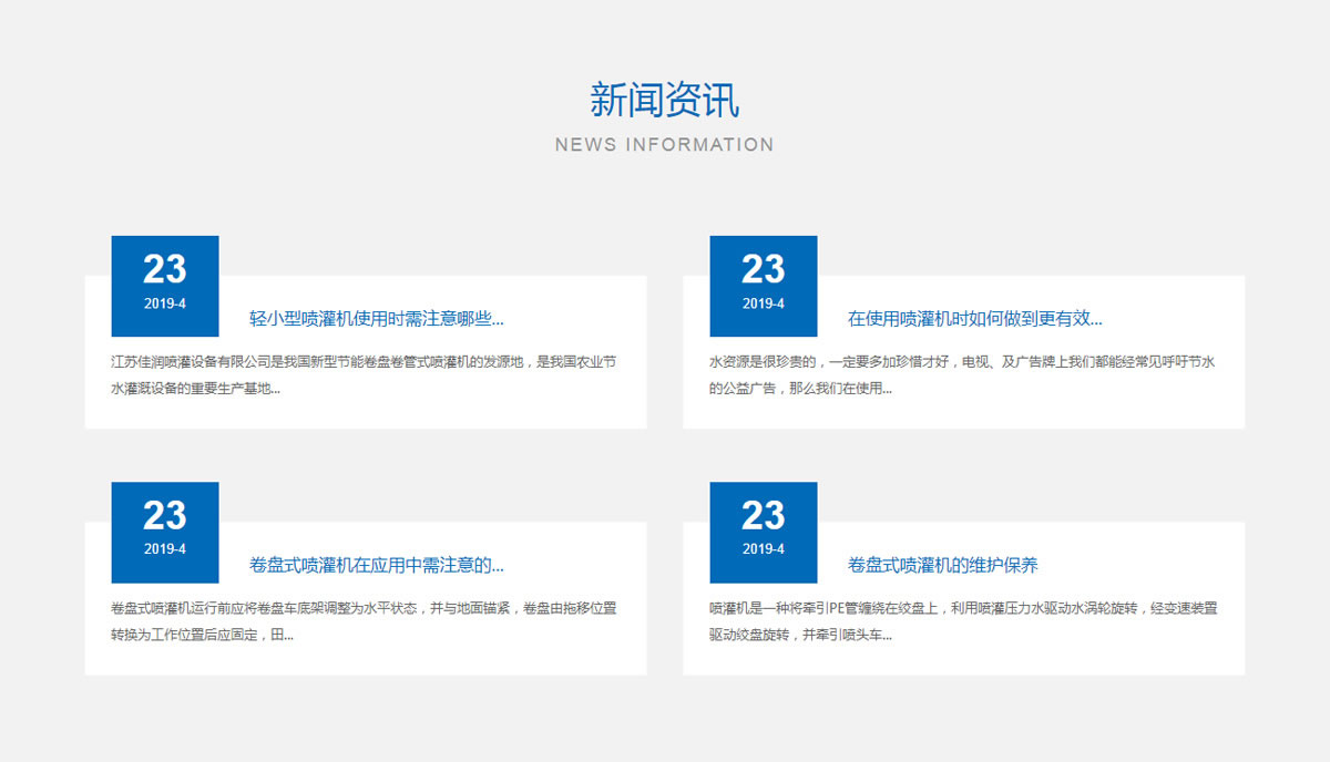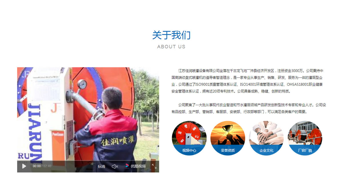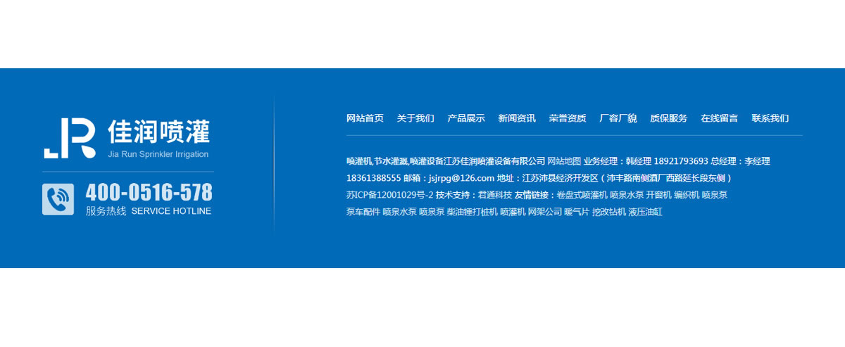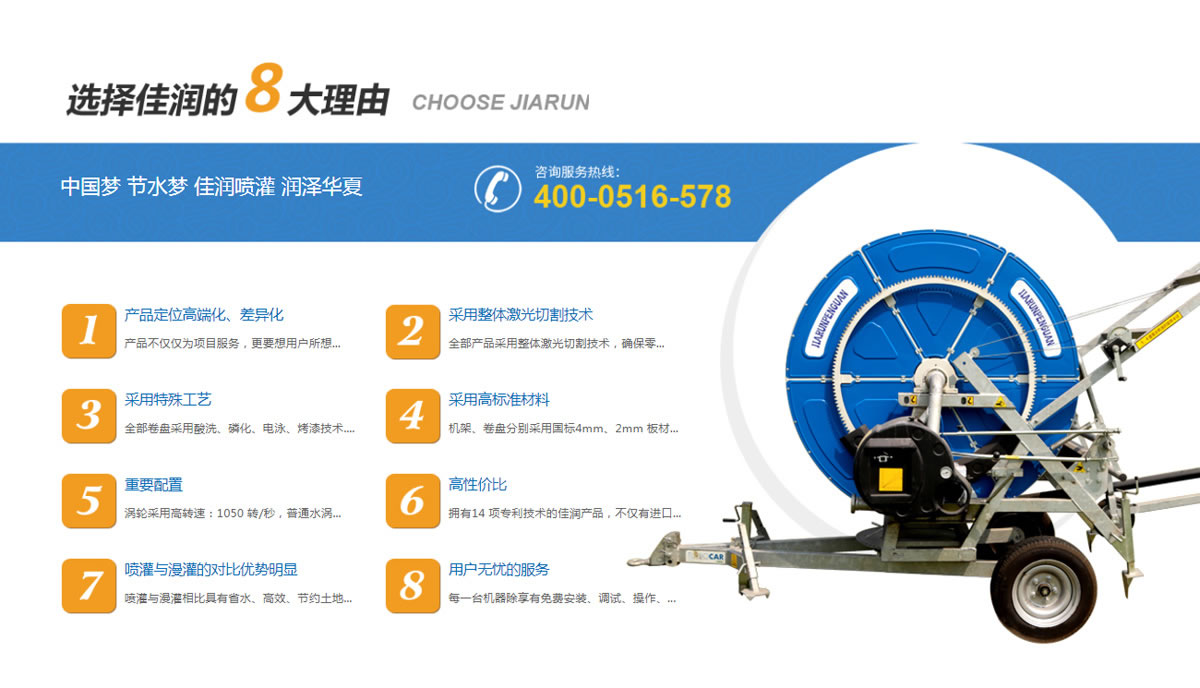 江蘇佳潤噴灌設備有限公司是一家專業(yè)從事生產(chǎn)、銷售、研發(fā)、服務為一體的灌溉型企業(yè),公司一直致力開發(fā)并推廣以下產(chǎn)品:噴灌機系列有標準型、施肥型、電機型、一體型、桁架型等各式噴灌機;研發(fā)灌溉輔助設施,如各式噴灌泵車、進口拖拉機泵、增壓泵。公司還致力研發(fā)各式噴槍,無論擊打式噴槍還是蝸輪蝸桿式噴槍,力求產(chǎn)品的使用更具穩(wěn)定性、可靠性。依期滿足滿足不同使用條件下的灌溉需求。