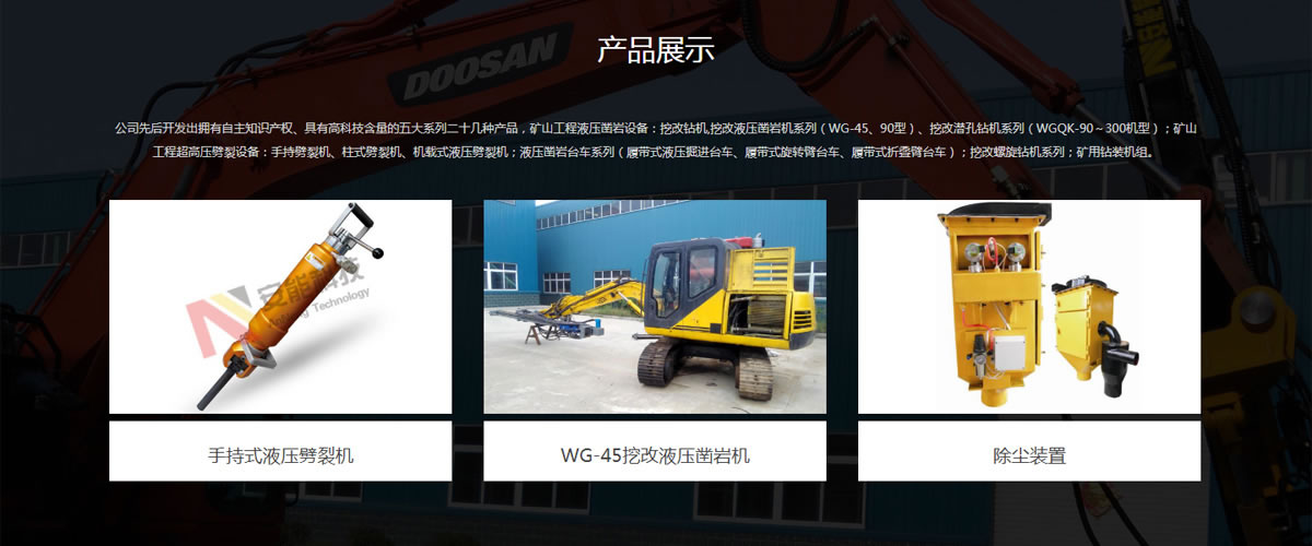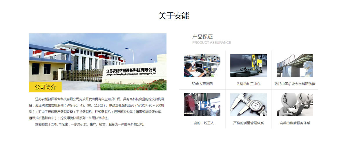 江蘇安能鉆掘設備科技有限公司是一家集研發、生產、銷售、服務為一體的高科技公司。 公司先后開發出擁有自主知識產權、具有高科技含量的五大系列二十幾種產品,系列一為礦山工程液壓鑿巖設備:液壓挖改鑿巖機系列(WG-20、45、90、115型)、挖改潛孔鉆系列(WGQK-90~300機型);系列二為礦山工程超高壓劈裂設備:手持劈裂機、柱式劈裂機;系列三為液壓鑿巖臺車(履帶式旋轉臂臺車、履帶式折疊臂臺車);系列四為挖改螺旋鉆機系列;系列五為礦用鉆裝機組。