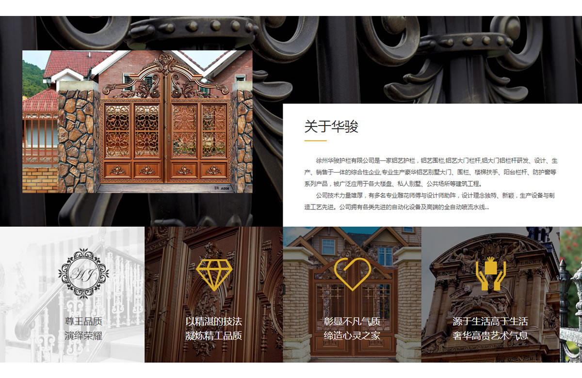 徐州華駿護(hù)欄有限公司是一家集研發(fā)、設(shè)計(jì)、生產(chǎn)、銷售于一體的綜合性企業(yè)。專業(yè)生產(chǎn)豪華鋁藝別墅大門、圍欄、樓梯扶手、陽(yáng)臺(tái)欄桿、防護(hù)窗等系列產(chǎn)品,被廣泛應(yīng)用于各大樓盤、私人別墅、公共場(chǎng)所等建筑工程。